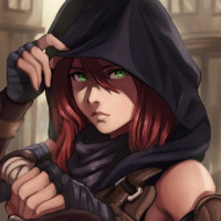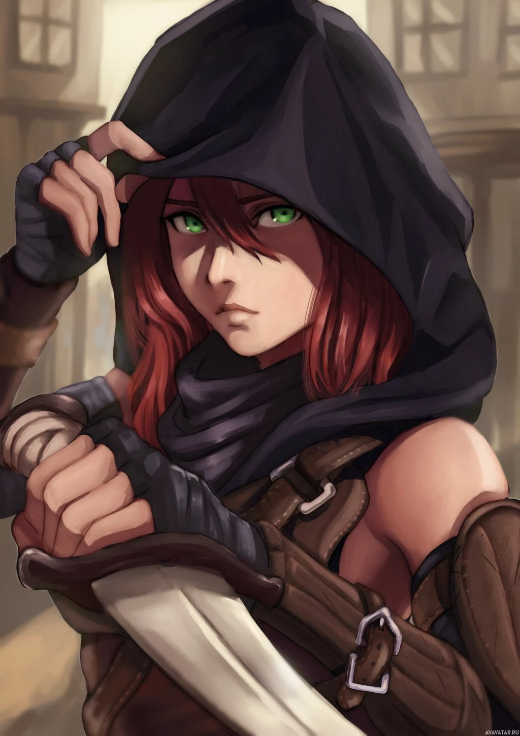 red hair and is wearing a black hood, which suggests she might be a member of a group like the Assassin's Guild in some fictional universe. She is also holding what looks like a pair of knives, indicating that she is