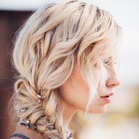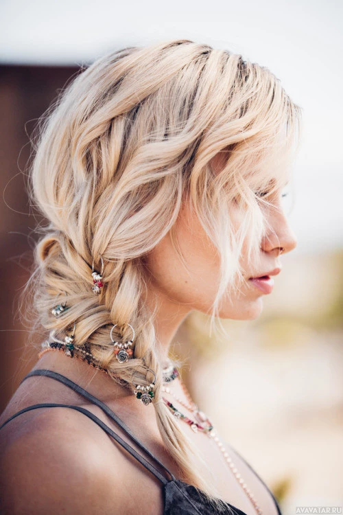 На картинке изображена женщина со светлыми волосами. У нее заплетенная прическа, и она носит то, что выглядит как топ или платье. На заднем плане есть наружная обстановка, предполагая, что это может быть в дневное время из-за естественного освещения.