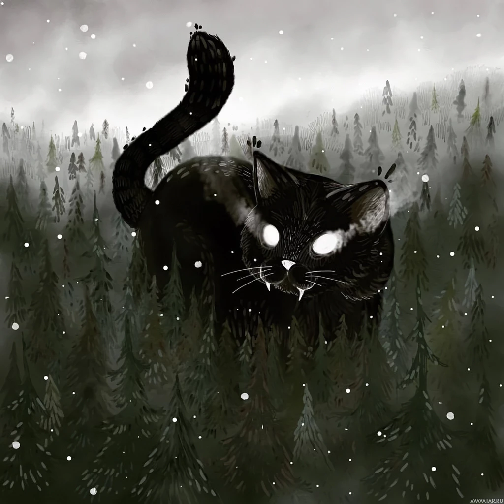 striking eyes and appears to be the focal point of the illustration. Snow is falling, which adds to the atmosphere of the scene. The trees are tall with snow-