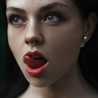 The image shows a woman with her tongue sticking out, appearing to be licking her lips or simply posing playfully. Her hair is dark and styled in
