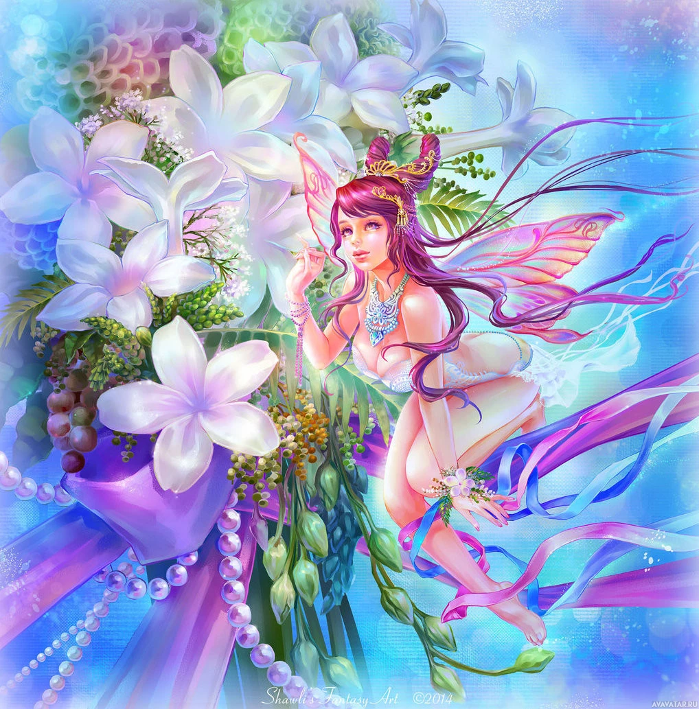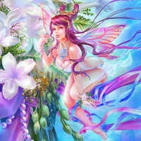 an animated character that appears to be a fairy. She is sitting among lilies and other flowers, which suggests a theme of nature or magic. The color palette is soft with