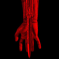 a red hand with tattoos, seemingly made of a metallic substance, reaching out towards the viewer. There appears to be a single drop of blood falling from the finger, which could symbolize an assassin's creed or a thematic element in