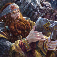 rocky terrain. The man's expression and the way he holds the axe give him a stern and