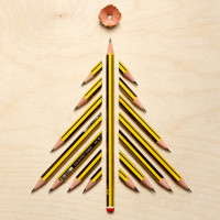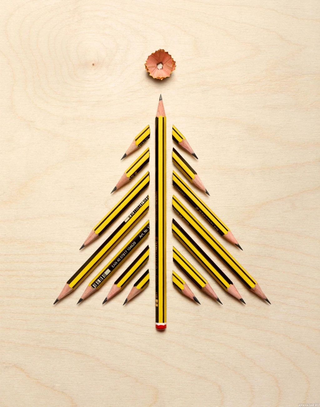 a Christmas tree, with the points of the pencils forming the branches and the bodies stacked in a way that suggests the trunk. There is also a single pencil placed on top as if it were a star or ornament atop the tree. This arrangement is
