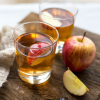 a warm beverage, possibly hot apple cider or mulled wine, filled with ice cubes and garnished with apple slices. There are whole apples, one of which has been cut in half, and the other sliced on the side as well. A