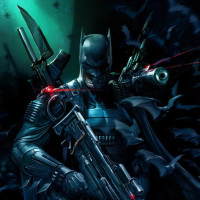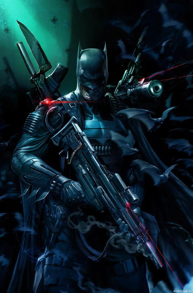На картинке изображен персонаж, одетый как Бэтмен, стоящий в подводной обстановке. Он держит в руках оружие, которое выглядит как пистолет-пулемет, и вокруг него разбросано другое оружие. Это изображение, вероятно, из видеоигры «Бэтмен: Аркхэм-Сити»