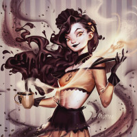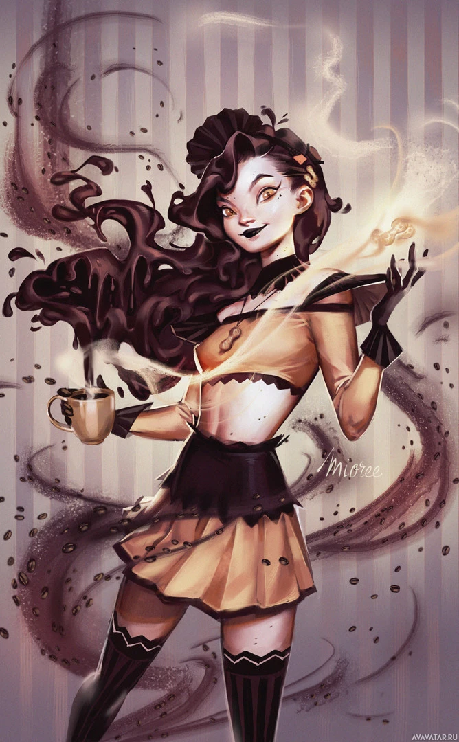 dark hair and is wearing what seems to be a costume with black and gold elements, possibly suggesting she's in a superhero or fantasy setting. There are dynamic coffee spills around her that give the impression of