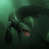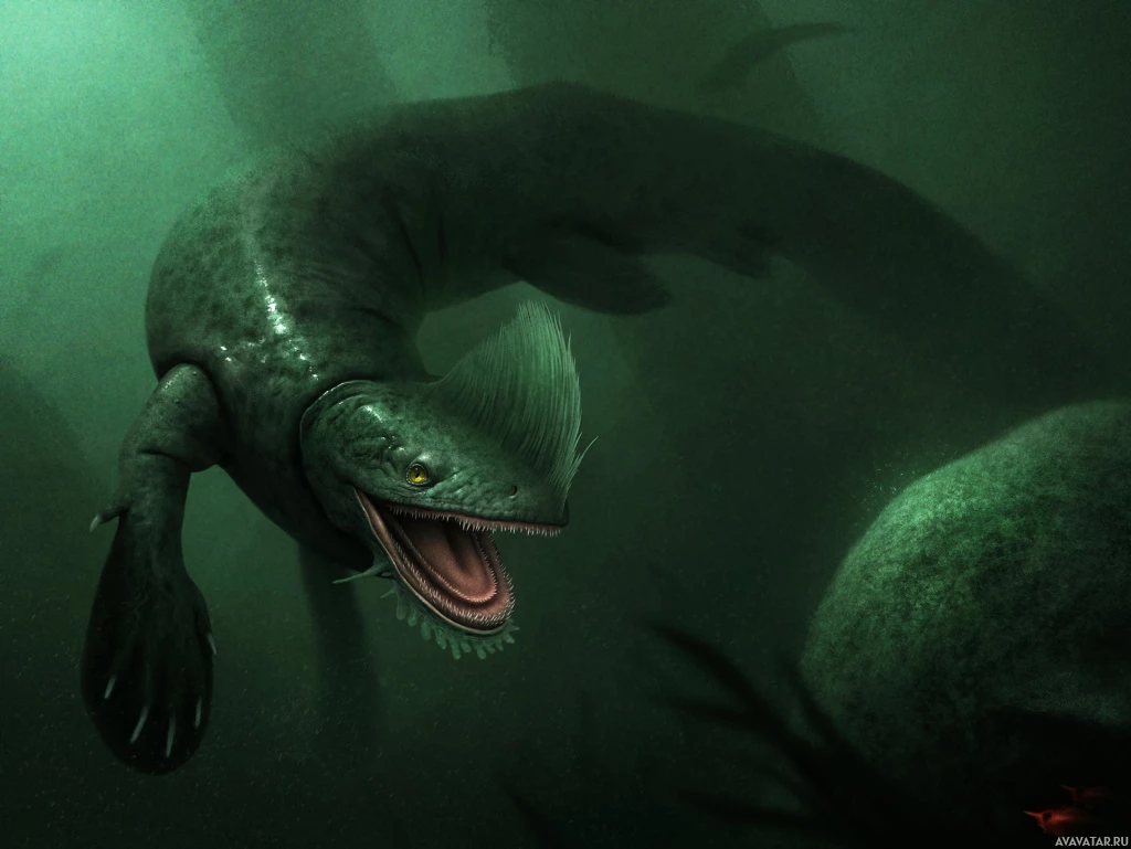 a fantastical scene of an aquatic creature that resembles a humanoid with a scaly body and gills, similar to the Loch Ness Monster or other mythical sea creatures. It appears to be in a deep