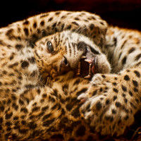 На снимке изображен леопард, лежащий на земле. Похоже, что он отдыхает или, возможно, играет со своими детенышами, так как поблизости есть два меньших леопарда. Один из них игриво кусает ногу взрослого. Все они, кажется, находятся в вольере, предназначенном для имитации их естественной среды обитания.