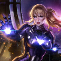 a dynamic pose with one hand extended, as if she's reaching out or ready for action. She is wearing what appears to be futuristic armor, which could suggest that this character is from
