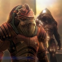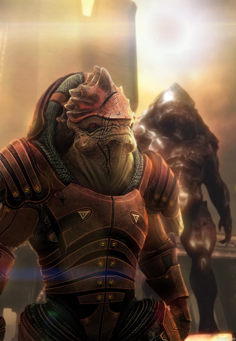 the video game "Mass Effect." On the left is a Krogan character, recognizable by its distinctive bipedal reptilian appearance and