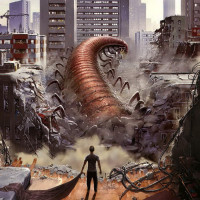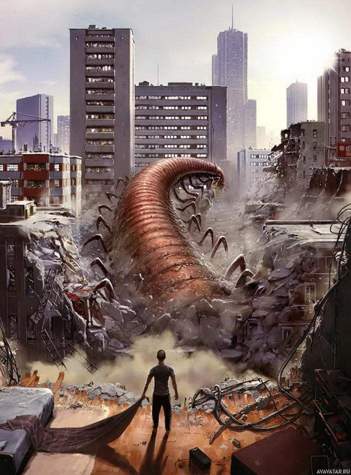 a silhouette of a person standing on the street amidst the chaos. The overall tone suggests a scene from a post-apocalyptic or dystopian future where such creatures exist and can wreak havoc on