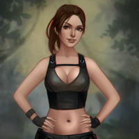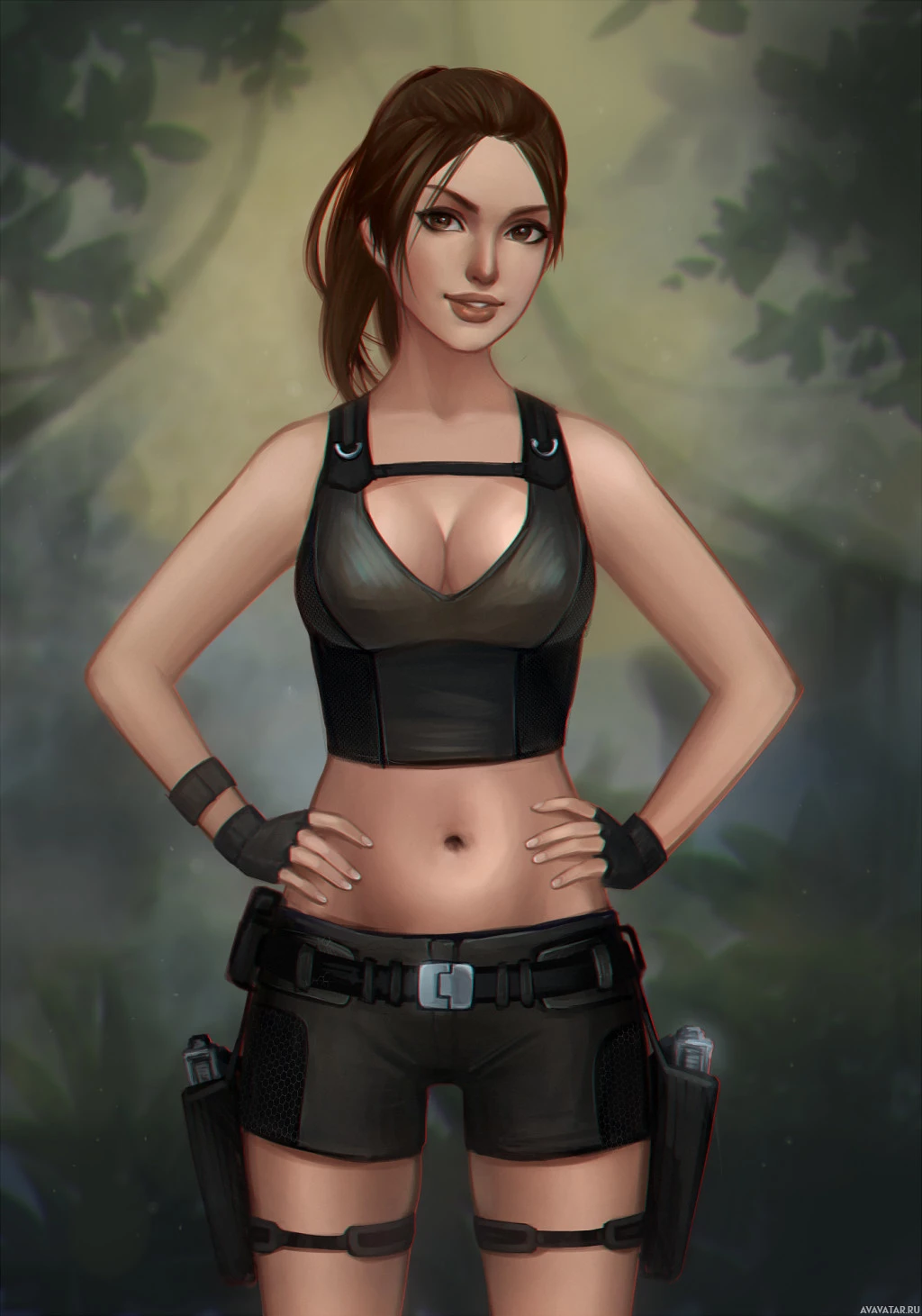 female character resembling Lara Croft, a famous protagonist from the "Tomb Raider" video game series. She is shown in a pose that suggests she is confident or ready for action, and she's wearing