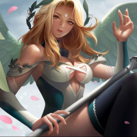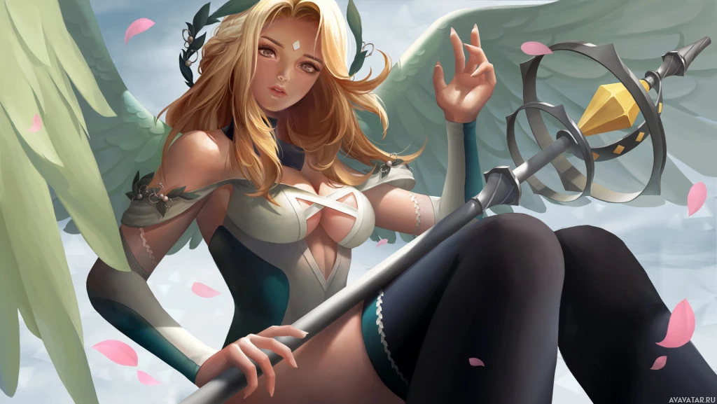 blonde hair, wings, and is wearing armor with what appears to be a helmet or headpiece that resembles antlers. In her hands, she holds a staff or weapon with a star on it, suggesting magical or divine power. The background features
