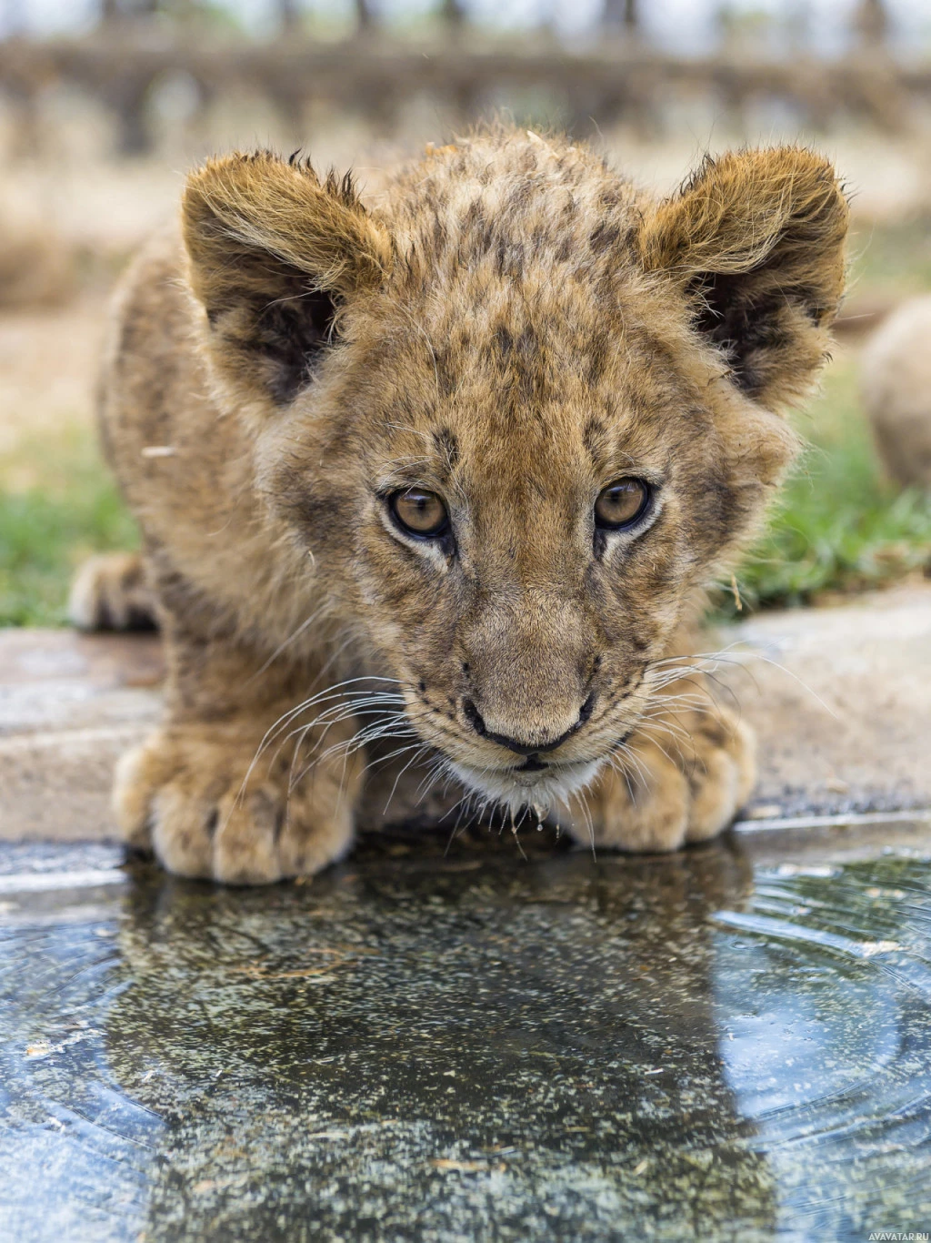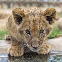 Картинка показывает молодого львенка, который смотрит на что-то перед собой с любопытством и бдительностью. Кажется, что он стоит на четвереньках, недалеко от края воды, возможно, наблюдая или ожидая напитка. Обстановка выглядит как вольер или среда обитания, разработанная, чтобы напоминать их естественную среду.