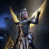 a fantasy character that is designed to resemble an angel. This character is standing amidst a dark, possibly rainy environment with lightning and