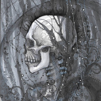 an artistic drawing of a skull. The skull is prominently displayed in the center of the composition, and it appears to be set against a background that suggests a forest or