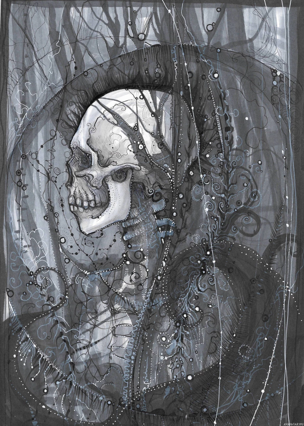 the forest floor, almost as if it were growing out of the ground. The style of the drawing has a somewhat gothic or eerie aesthetic, with the use of black and white tones enhancing this macabre theme. The background is also adorned with various decorative elements such as lines, dots, and what appears to be