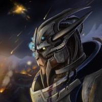 the armor design and distinctive blue skin with patterns commonly associated with Turians in the game. The character appears to be in