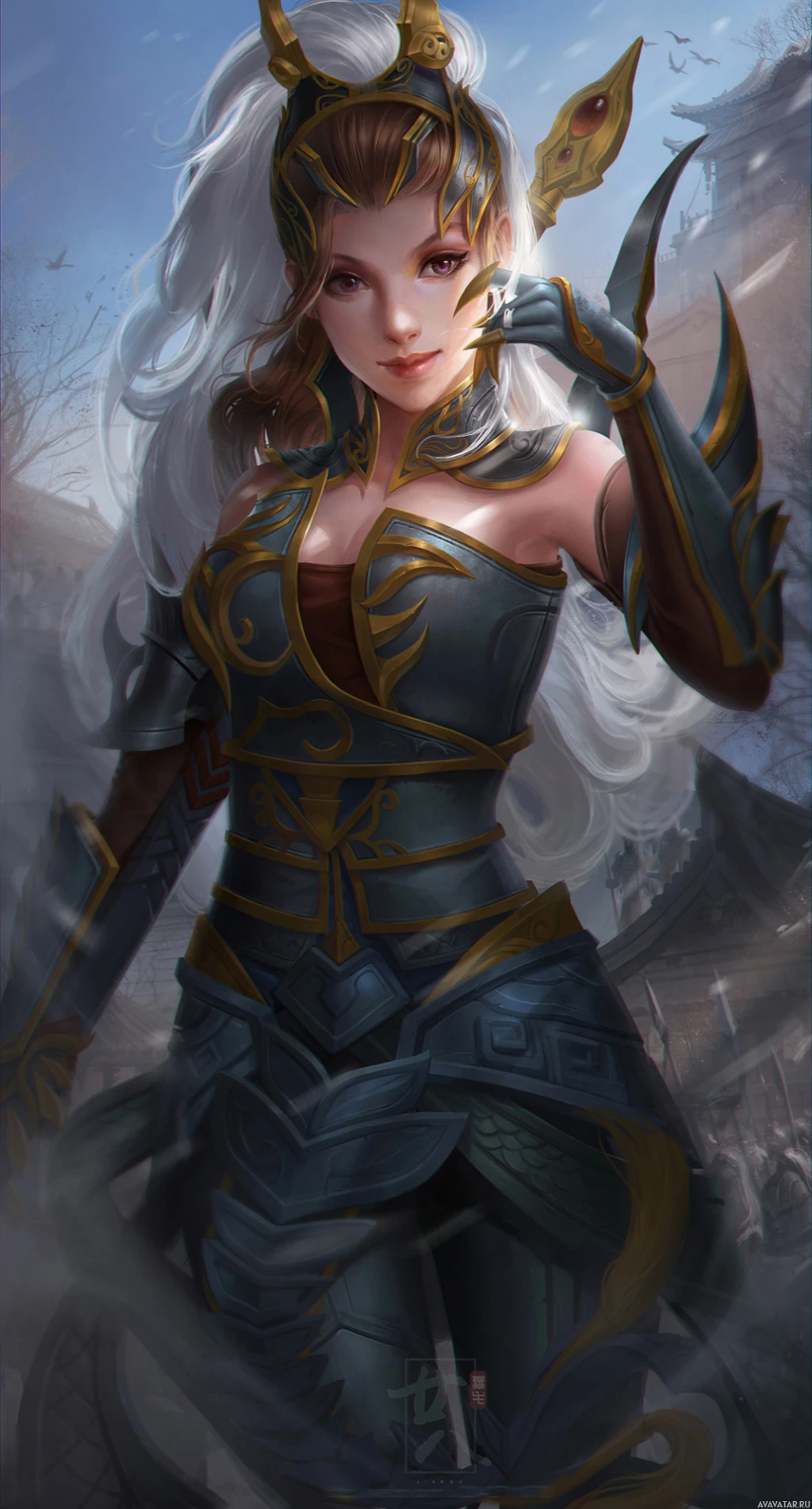 mythical figure, resembling a warrior or an archer. She has