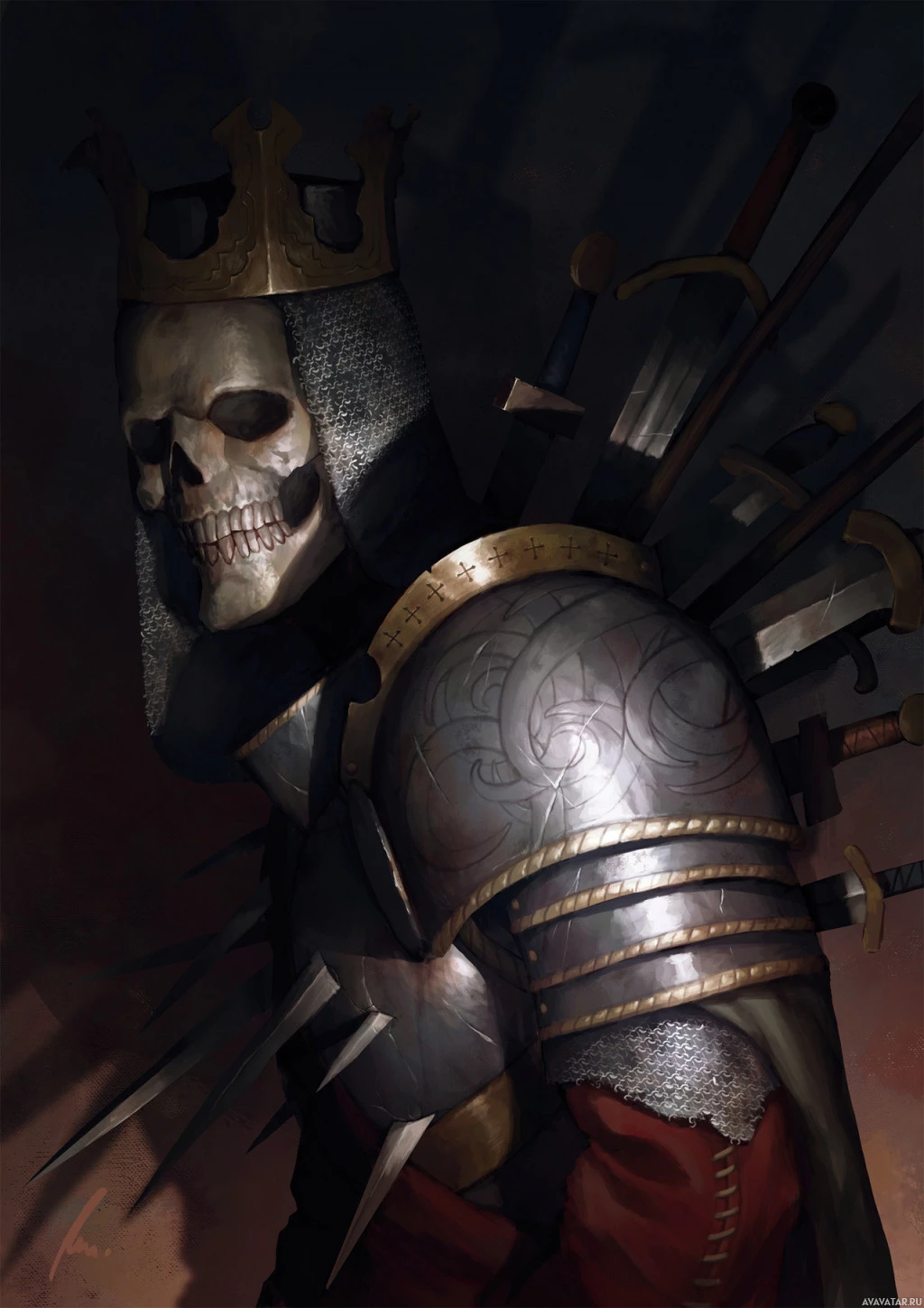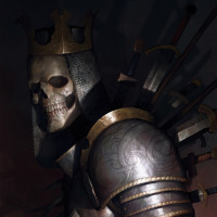 medieval armor. The skeleton is adorned with a crown, suggesting royalty or high status within its context. Surrounding the skeleton are