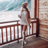 knee boots. In her hand, she holds a cup. Her hair is styled in loose waves, and she has a relaxed posture, facing away from the camera towards