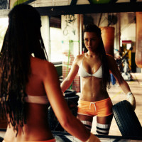 sports attire and appears to be working out or stretching. The reflection shows that she has her arms extended and is holding a barbell or weight above her head, indicating she might be performing an exercise related to