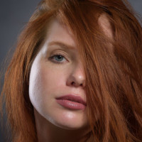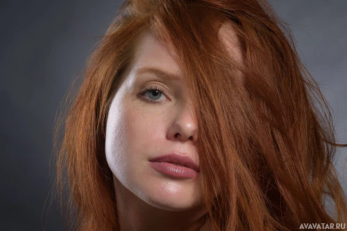 red hair. She appears to be looking downward and slightly away from the camera, which gives her a contemplative or introspective expression. The lighting is soft, suggesting it may be