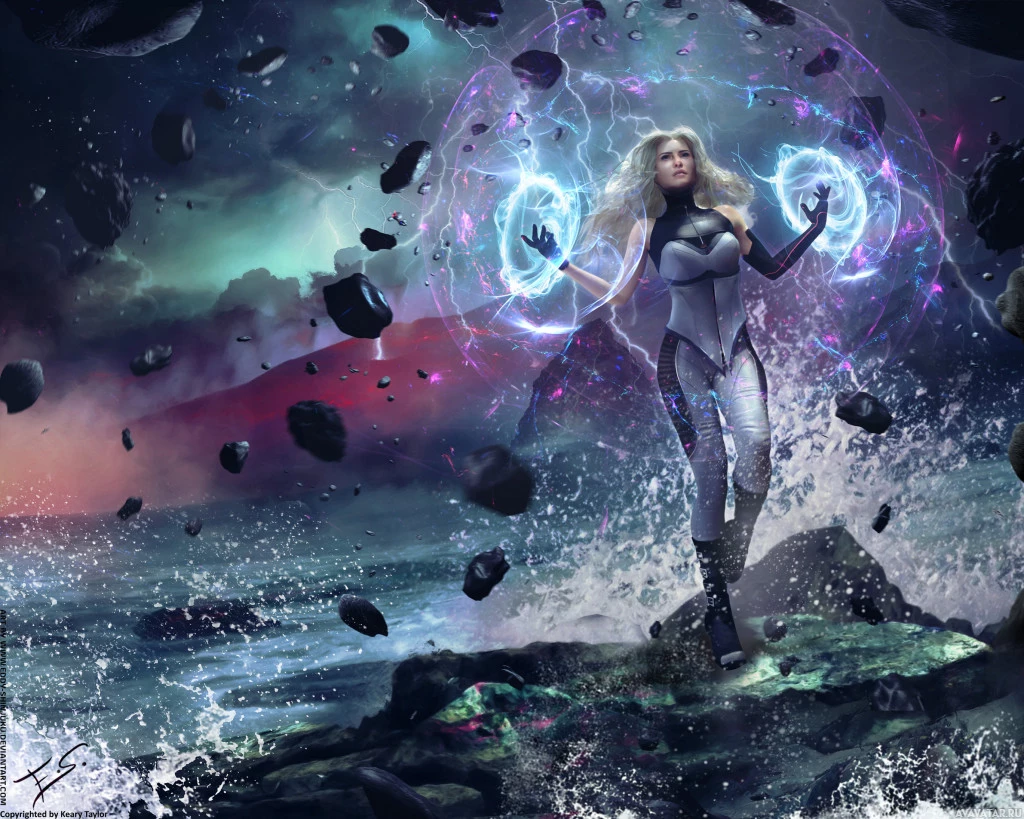 a rocky shore, surrounded by floating debris and splashing water, suggesting that she might have been the cause of this disruption or that it is part of her abilities. There are magical elements around her hands, such as