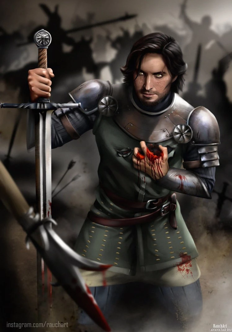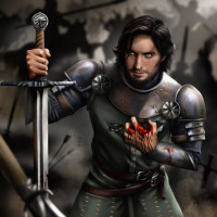a warrior character. He is dressed in medieval-style armor and holding a sword, indicating that he is likely engaged in battle or a conflict of some sort. There are also elements suggesting a chaotic or bloody scene, such as