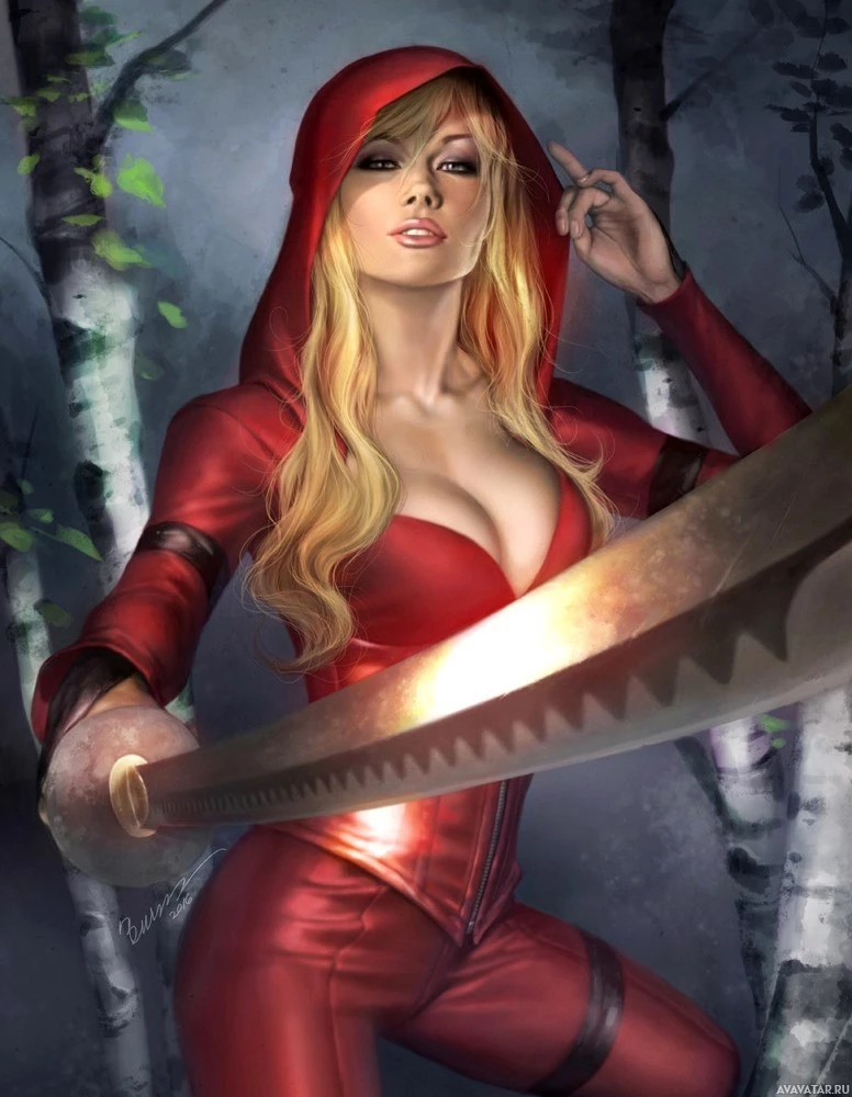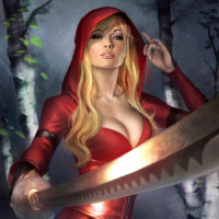 a female character wearing red, hooded attire that resembles a costume. She has