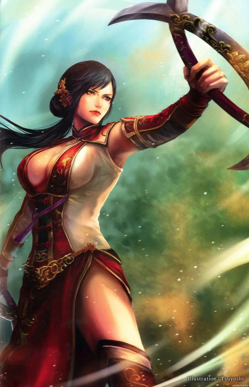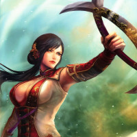 dark hair and is dressed in what appears to be armor with some intricate details. The background suggests a mystical or fantasy setting, possibly a forest given the misty appearance. The character's expression and posture convey confidence and readiness for combat.