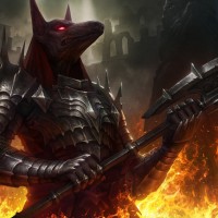 pointed ears, and its eyes are glowing red. The character is wearing armor and holding what looks like a staff or weapon, suggesting it may be a warrior or guardian archetype in this