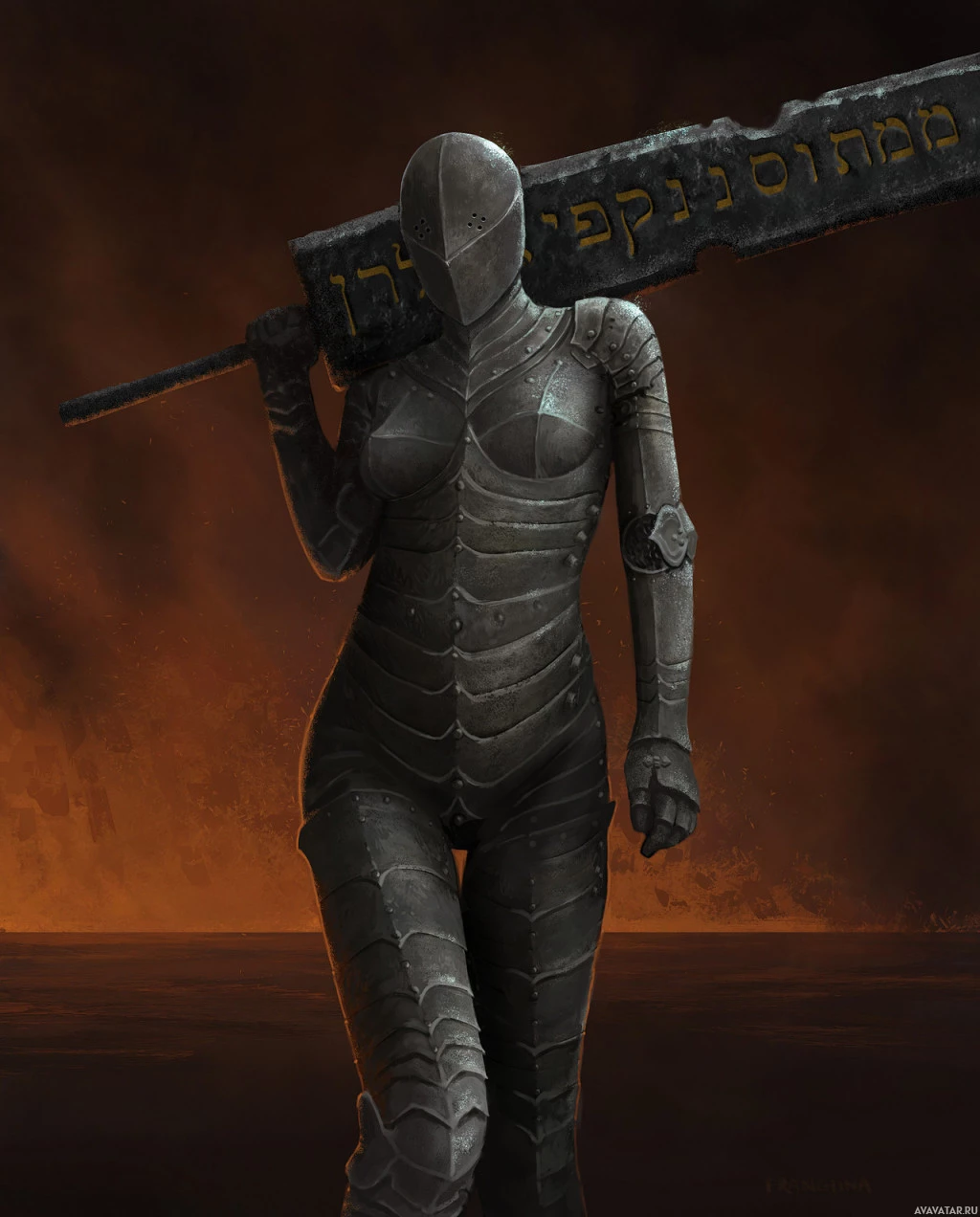 elaborate armor and carrying what appears to be a staff or weapon with Hebrew text on it, which might suggest a mystical or ancient context. The background shows