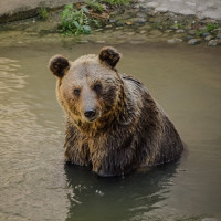 На картинке изображен бурый медведь, сидящий на мелководье. Медведь кажется частично погруженным, только его голова и спина видны над поверхностью воды. Фон не четко определен, но, похоже, показывает наружную обстановку с растительностью, которая предполагает, что это может быть естественная среда обитания или, возможно, заповедник дикой природы, предназначенный для имитации такой среды.