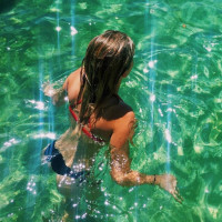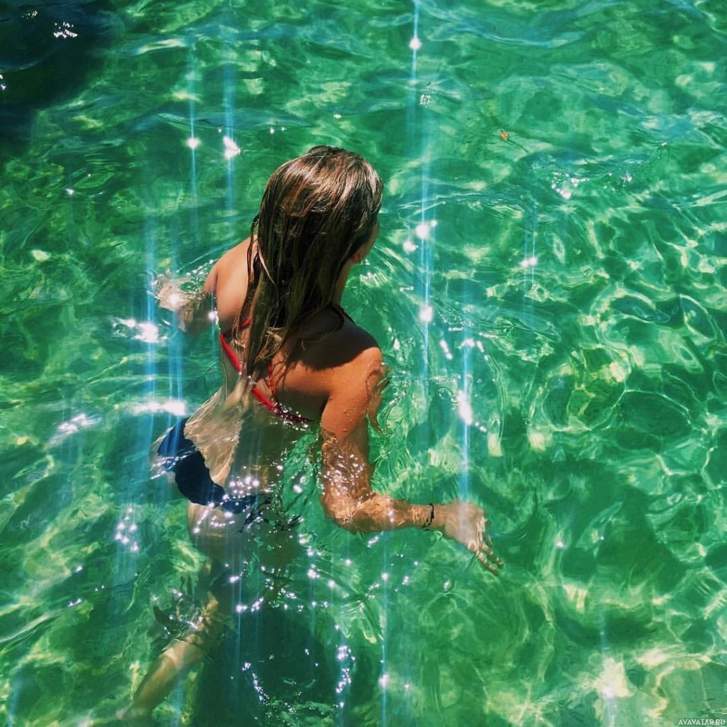 The image shows a person, likely a girl or woman, swimming in clear,
