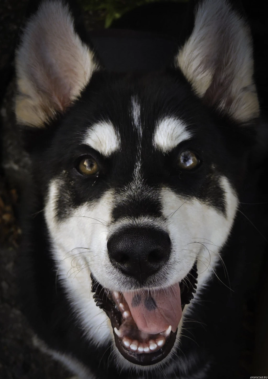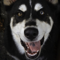 looking dog, likely a husky or similar breed, with a mix of white and black fur. Its ears are perked up and its mouth is slightly open as if it's panting or smiling. It appears to be standing in
