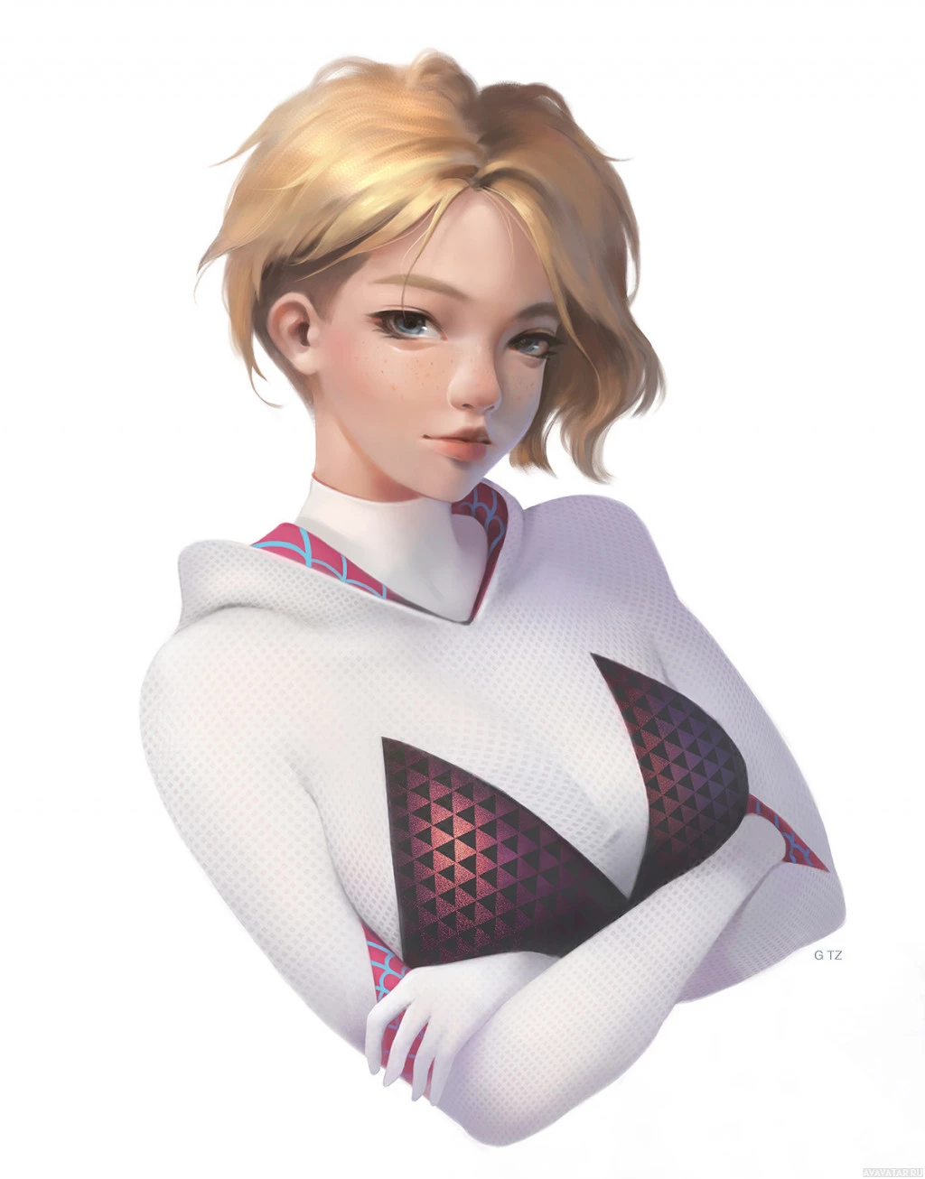 The image appears to be a digital illustration of a female character. She has short hair, is wearing a hoodie with a graphic print on it and pants that match the design of her hoodie. Her pose suggests she might be in a contemplative or thoughtful mood. This style of illustration is often used for creating characters in video games or animated content.