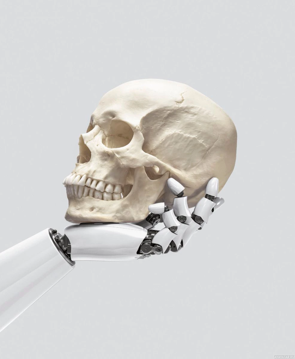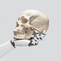 a robotic hand holding a skull. The background is a gradient of light gray to white, giving the impression that this interaction is taking place in a sterile or clinical environment. This scene likely represents a concept related to