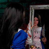 the character Alice from the Lewis Carroll books. They are standing in front of a mirror, looking at their