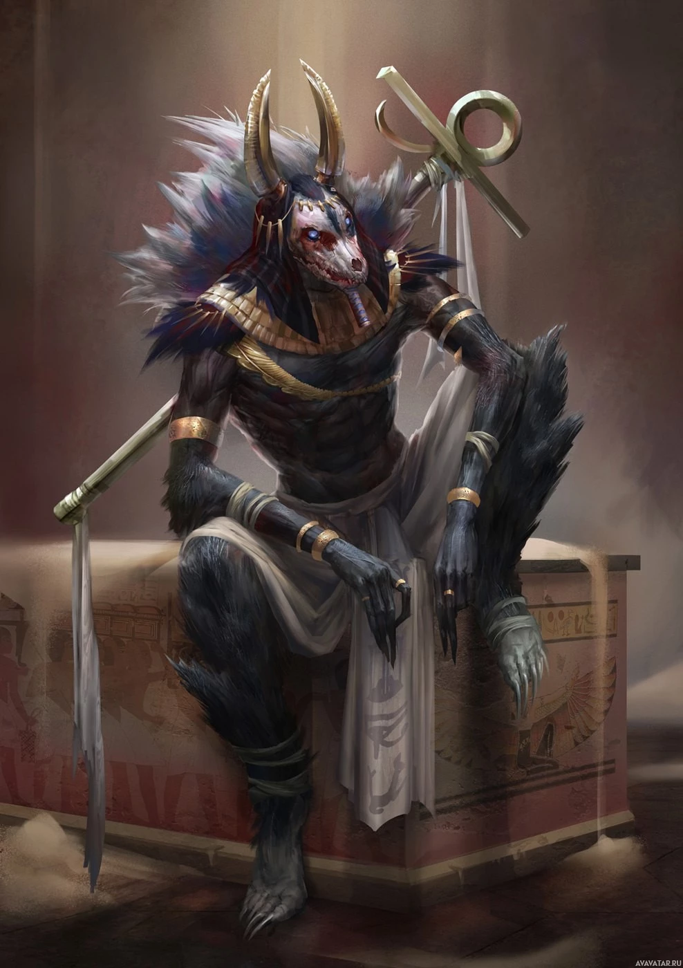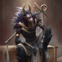animalistic traits like ears and claws, which are commonly associated with wolves or similar creatures in mythology. The character is adorned with traditional Anubis attire, including a headdress with the jackal's head motif,