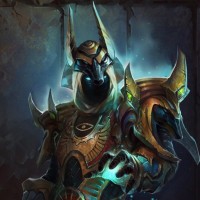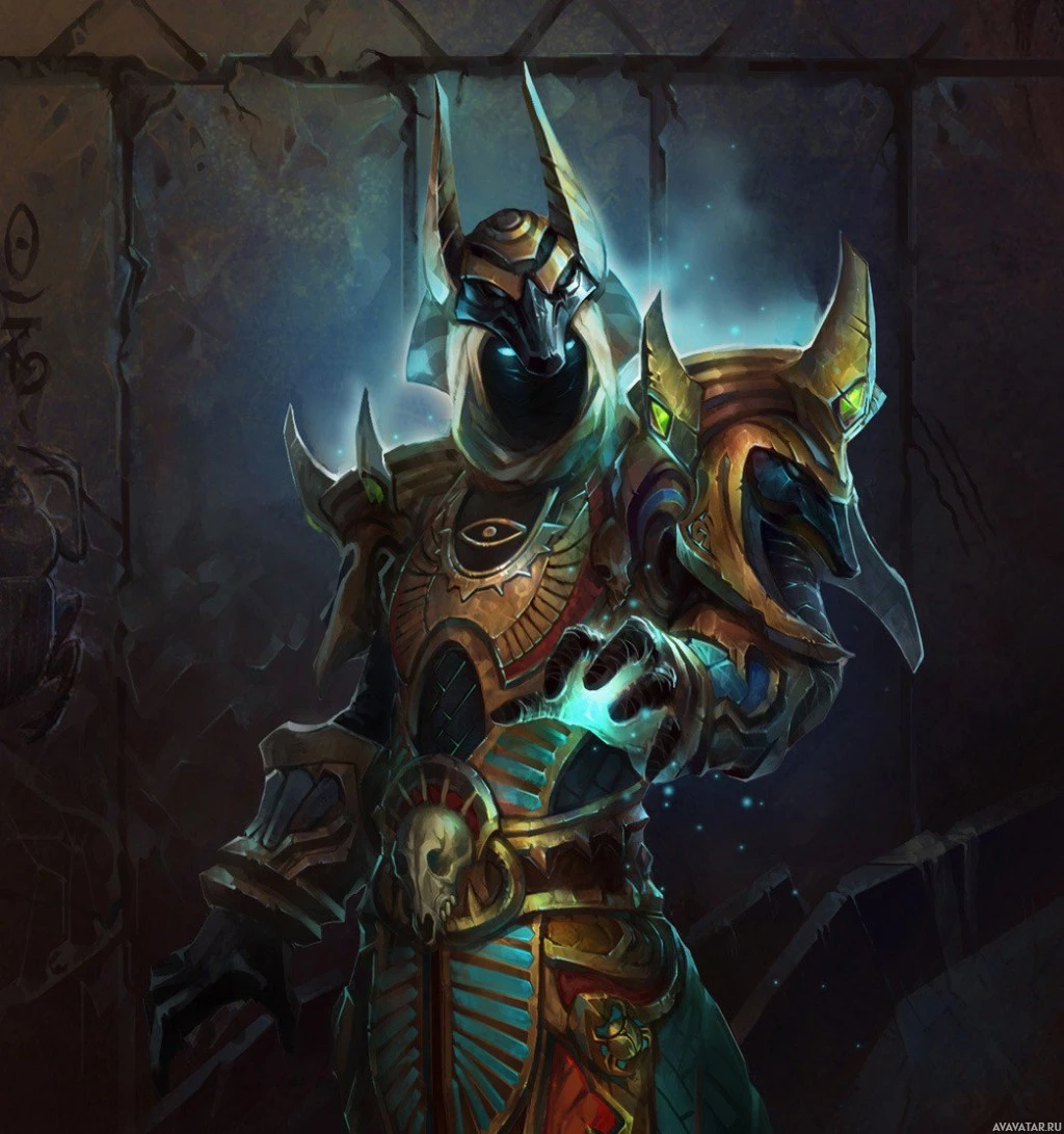 the fantasy genre, often associated with Egyptian mythology due to the stylistic elements in their attire and the overall aesthetic. This character is likely inspired by Anubis, an ancient