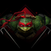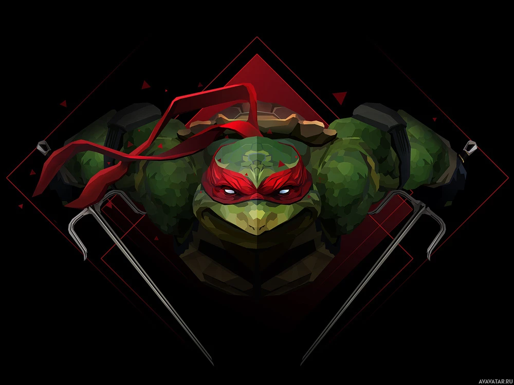 На картинке изображен персонаж Черепашек-ниндзя Рафаэль, который узнаваем по его красной бандане и саису. Он иллюстрирован стилизованным образом, вероятно, предназначенным для напоминания оригинальных иллюстраций комиксов.