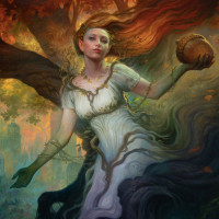 mystical tree, with her arms extended as if she is embracing the tree or nature itself. Her attire suggests she might be a dryad or a fairy, which are