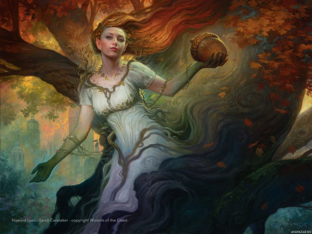 mythological creatures often associated with trees and forests. The setting includes autumnal colors in the foliage and a castle-like structure in the background, adding to