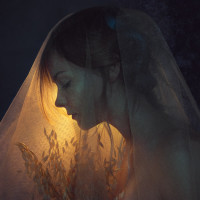 the soft lighting on the subject, highlighting her features. There's also a veil draped over her shoulders, suggesting she may be wearing