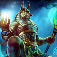 The image shows a fantasy-themed illustration of a character resembling Anubis, the ancient