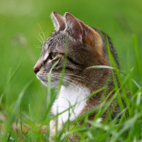 The picture shows a small cat in the grass. The cat appears to be either sitting or lying down, and its body is mostly obscured by the tall grass. It looks like it might be a young kitten due to its size and appearance.