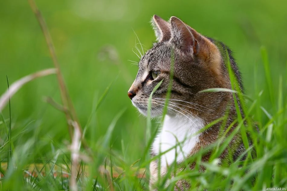 На снимке изображена маленькая кошка в траве. Кошка, кажется, либо сидит, либо лежит, а ее тело в основном затенено высокой травой. Похоже, что это может быть молодой котенок из-за его размера и внешнего вида.