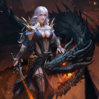 blonde hair and an armored dragon on her shoulder. The character is holding a sword in one hand and has the appearance of being in combat or battle-ready, facing forward with determination. The background suggests a fiery or volcanic environment, possibly during